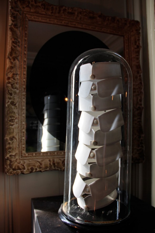 I am big believer in the beautiful display of everyday objects. Hence, I love this idea of putting everyday basic bowls and plates on open shelves (as above), or collars beneath a belljar, which is normally reserved for things like taxidermy animals or precious objects (as below).