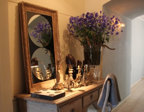 A collection of candlesticks, a painting laid on the desk, a double-circle mirror, and fresh flowers work to create a living still life in the corridor that serves as sort of foyer that links the studio with the kitchen and bathroom.