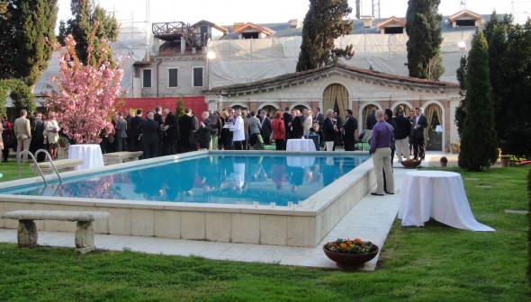 Fortuny’s Glicine Red Museum Texture hangs from a clothesline and backgrounds the cocktail party in the Giudecca Gardens.