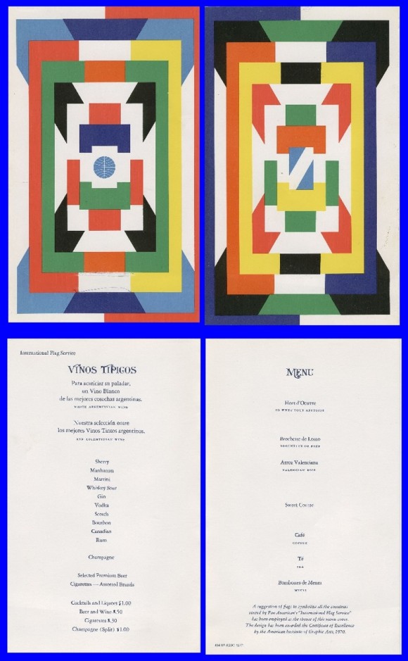 Architecture, interiors, unifroms, place settings. And oh yes, paper products. The in-flight menus (featuring food by Maxim’s of Paris on many Pan Am flights) became limited edition prints created by artists of the day such as Dong Kingman or Ivan Chermayeff, some of which are now highly collectible and valuable. These menus featured on Pan Am’s Round the World Service in the 1970’s.