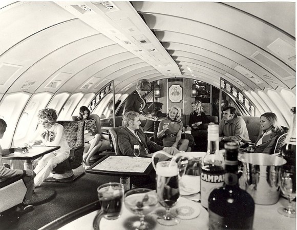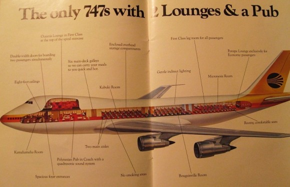 Look carefully at the above image of a Continental 747 in the early 70’s. First class legroom for all passengers? A Kabuki room? A Polynesian Pub? And a lounge at the back for Economy passengers, nevermind the bubble lounge – or “Oceania Lounge at the top of the spiral staircase” – for First Class passengers.