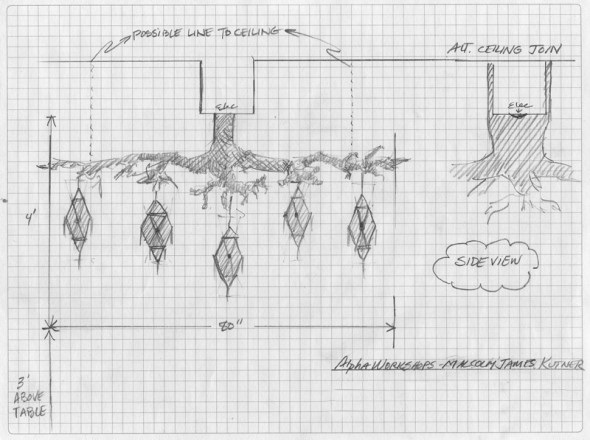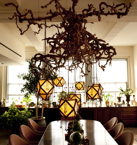I have been working with a longtime client and friend on her urban loft space off and on for a few years now. When it came to replacing an old dining room light fixture, my client said wanted something that was “like a branch or something, coming out of the ceiling, with lights somehow integrated into it.”