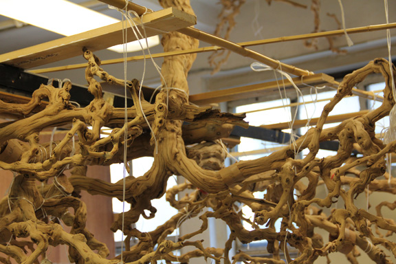 The armature itself, pictured above, consists of several grapevine roots and branches that have been put together to look as if the whole thing is one massive root system or upturned dwarf tree. We needed to achieve an overall size of 8 feet by 2 feet to cover a 12-foot dining table. As grapevine roots are small, this required several consultations at the Alpha Workshops studios to design and refine the armature itself. In the end, we used several part of several root systems to create the appearance of one giant, upturned grapevine tree.
